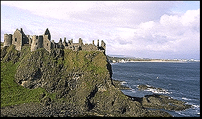 The nomadic boatmen - Ireland's first inhabitants - who crossed from south-west Scotland in about 7,000 BC and left their flinty axes all along this rugged coast, must have seen the crag from the sea and may have ventured their flimsy coracles into the huge cave that runs through the rock to the land. You can still visit it by boat today. The early Christians and the Vikings were drawn to this romantic place and an early Irish fort once stood here. For its crowning glory, however, the crag had to await the coming of those master-builders, the Normans. They had a habit of consolidating their victories by building castles, and they knew a good site when they saw one. The battling MacDonnells ruled all this north-eastern corner of Ulster in the, late 16th century. Steeped in myth and legend and inhabited by giants, ghosts and banshees wailing through the sea mist, it has the most dramatic coastline in the British Isles, a veritable textbook illustrating the geological story of the earth. The ancient rocks stick out as brightly coloured cliffs along the edge of the plateau. There are red sandstones, white chalk, black basalt and blue clavs. Richard de Burgh, Earl of Ulster, first built this castle at Dunluce. It often came under siege. In 1584 Sorley Boy MacDonnell captured it from the English when one of his men, employed in the castle, hauled his comrades up the cliff in a basket. Sorley Boy came into some money in 1588 when the Spanish Armada treasure ship Girona was wrecked by storm off the Giant's Causeway. He used it to modernise the castle but he must have skimped on the kitchen, since in 1639 it fell into the sea and carried away the cooks and all their pots. Today the pretty blue flower of Dunluce' clusters round the castle's ruined shell and drifts of seapinks are the only sentinels.