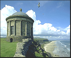 ![]() Mussenden Temple Three miles north of Derry (take A2) is the Earhart Centre at Ballyarnet. The first woman to fly the Atlantic solo, Amelia Earhart, brought her plane down here in 1932. Hilltop Open Farm nearby specialises in rare breeds of pigs and sheep. South are the rolling Sperrin Mountains with their forests and river glens. To the east and north-east are wide Lough Foyle, Magilligan Strand (Ireland's longest beach) and the lovely and fascinating Roe Valley Country Park. West and north lies rugged County Donegal. All these areas provide marvellous fishing. For the motorist or walker they provide endless variety. The shortest route to the Sperrins is up the pleasant valley of the river Faughan. The route passes Ness Wood, where the Burntollet river plunges 30 feet over Ulster's highest waterfall. Nature trails wind among the trees: oak, ash, birch, pine, silver fir, holly, hazel, willow, alder, rowan, rhododendron. A mile from the Ness is Loughermore Forest, which has a caravan site amid wild scenery. The head of the Faughan valley is at Learmount Forest, popular for walks. Close by soars Sawel (2,240ft) highest mountain in the Sperrins. There are valleys with streams on every side. Near Claudy, Cumber House Riverside Park is a 22-acre picnic area and nature reserve on the banks of the Faughan, and there are seven acres of riverside parkland at Ardmore. Seaside and VillagesHeading east towards Limavady is a fertile plain, reclaimed by dykes from Lough Foyle, with villages and small towns established in the 17th century by the City of London guilds. Eglinton (established by the Grocers' Company) still has an English air about it, with elegant church, former market house, trees around a green and two oaks which started life in Windsor Great Park. South of the village is Muff Glen with walks and bridges over its little rushing stream. Birdwatchers should see the glen and then walk along the top of the embankment of Lough Foyle where the mud flats at low tide are feeding grounds for seabirds and waders. The shore sweeps out to Magilligan Point, where the shingle becomes pure sand, rounding the point and forming the famous six-mile Atlantic beach. A massive Martello tower stands at the point: and at the far eastern end of the strand, on a clifftop, is another circular edifice - the Mussenden Temple, a perfect replica of the Roman temple of Vesta. A few decades before the menace of Napoleon brought Magilligan's Martello tower into existence, Frederick Augustus Hervey, wealthy Bishop of Derry and Earl of Bristol, built a palace on a windswept headland at Downhill. Today the palace is in ruins but his library, the Mussenden Temple, is still intact. Despite his extravagances, Hervey was a good bishop. The mountain road he built to Limavady gave work to the local people. The road runs across Binevenagh plateau, with splendid views of the Scottish coast and Donegal. Magnificent Benone Strand won the European Blue Flag award. Hundreds of yards wide at low tide with thundering Atlantic breakers, it is popular for shore fishing, particularly bass. You can sometimes see sailplanes and hang gliders from the viewpoint on the Bishop's road. Inland from Magilligan is the village of Ballykelly, close by the old town of Limavady. Ballykelly was founded by the London Fishmongers' Company and old Walworth House retains three stocky towers and part of its defensive bawn wall. The Sampson Tower in Farlow Wood, one mile west of Limavady, is an intriguing Gothic-style memorial erected in 1860 to Arthur Sampson, agent for the Fishmongers' Company. Limavady was founded in Elizabethan times. It is one of Ulster's most characteristically Georgian towns. It was here that Jane Ross noted down the famous Londonderry Air ('Danny Boy') from a passing fiddler. But its great charm for the tourist is the Roe Valley Country Park. The river Roe winds through gorges where the rapids turned the waterwheels of several mills. The mills and a 19th-century hydro-electric plant have been restored, and the weaving shed houses a museum. The park has a modern visitor centre and a camping and caravan park. The 18-hole Roe Park golf course is on the western outskirts of the town. The Iron Age fort known as the Grianan of Aileach is seven miles north west of Derry, in County Donegal. For centuries the seat of the O'Neills, high kings of Ulster, it has panoramic views over Lough Swilly.